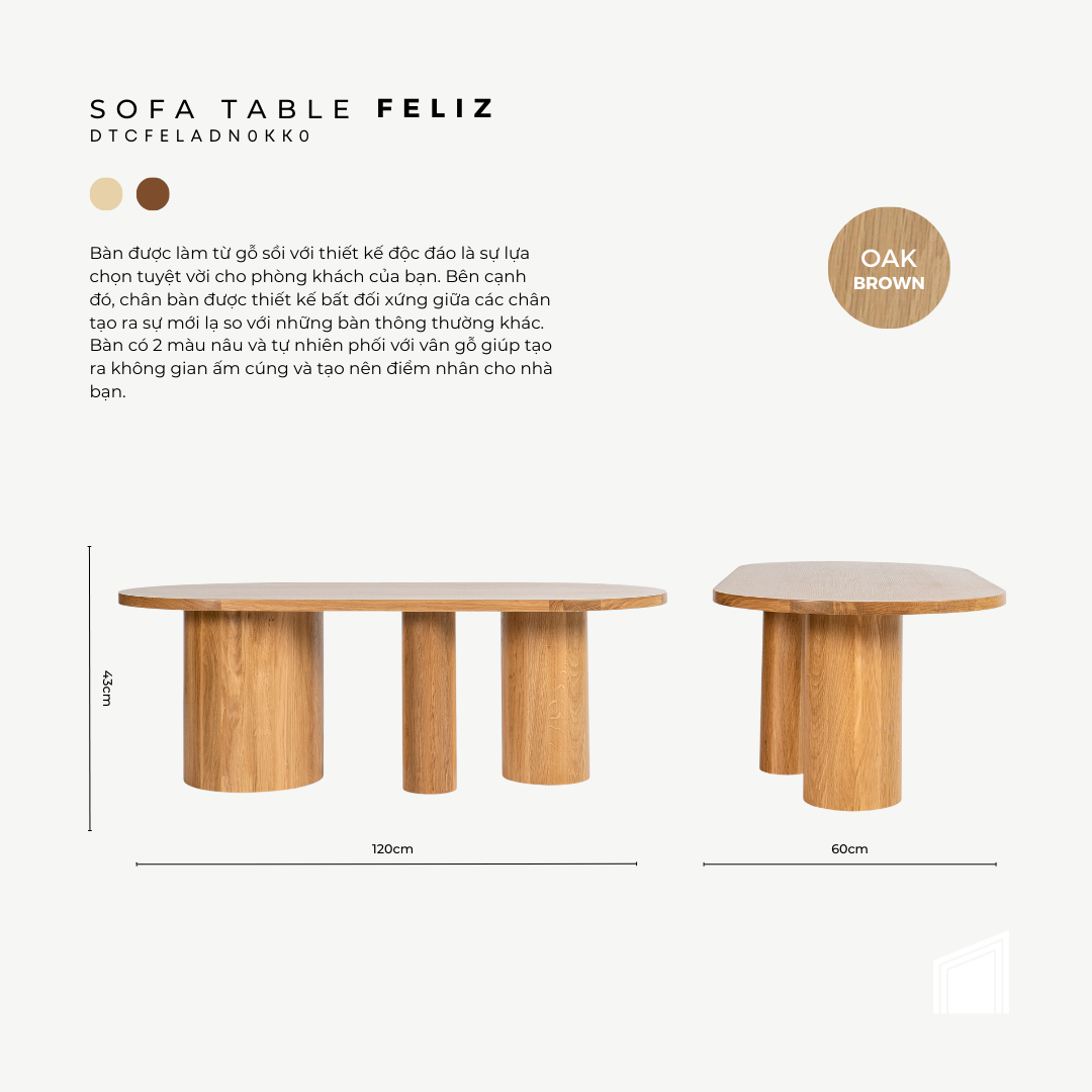 Bàn được làm từ gỗ sồi với thiết kế độc đáo là sự lựa chọn tuyệt vời cho phòng khách của bạn. Bên cạnh đó, chân bàn được thiết kế bất đối xứng giữa các chân tạo ra sự mới lạ so với những bàn thông thường khác. Bàn có 2 màu nâu và tự nhiên phối với vân gỗ giúp tạo ra không gian ấm cúng và tạo nên điểm nhân cho nhà bạn.