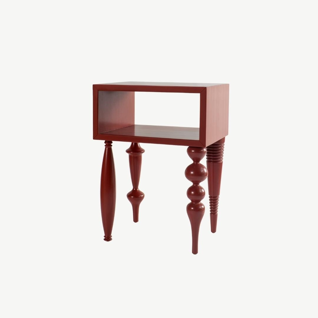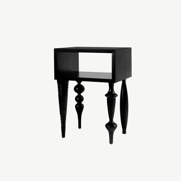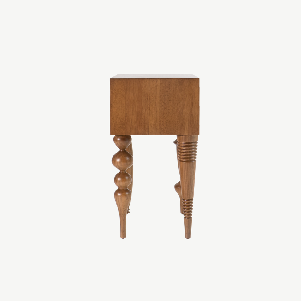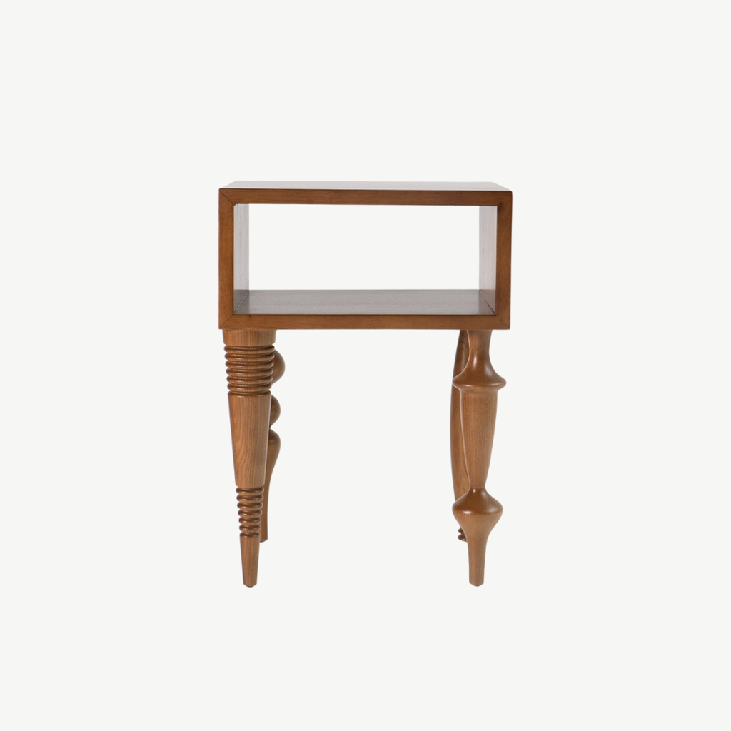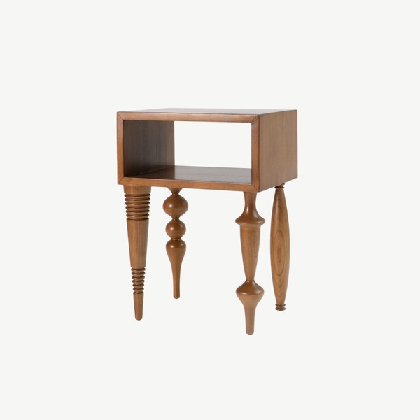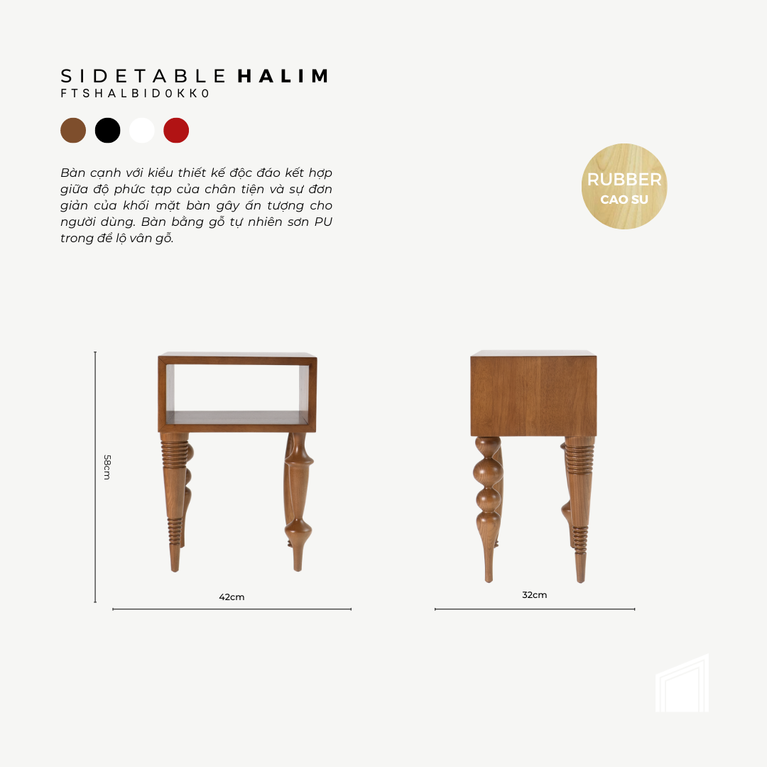 Bàn cạnh với kiểu thiết kế độc đáo kết hợp giữa độ phức tạp của chân tiện và sự đơn giản của khối mặt bàn gây ấn tượng cho người dùng. Bàn bằng gỗ tự nhiên sơn PU trong để lộ vân gỗ.