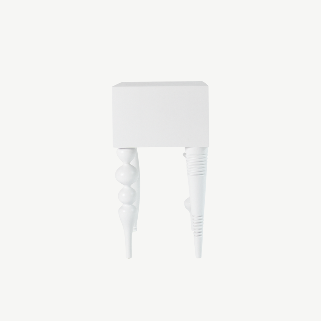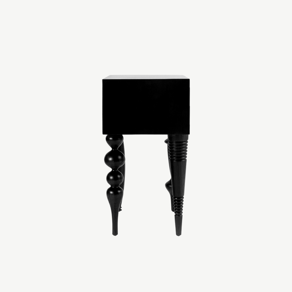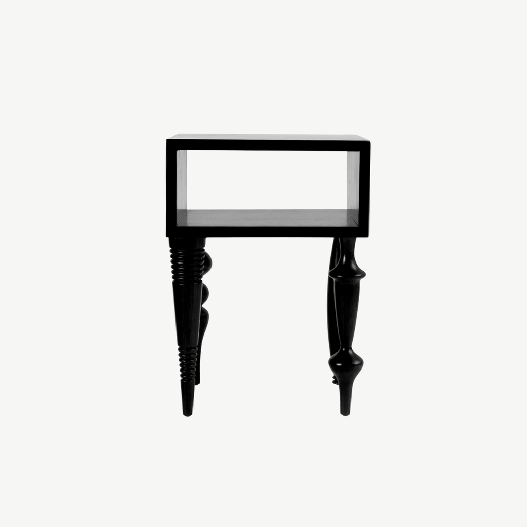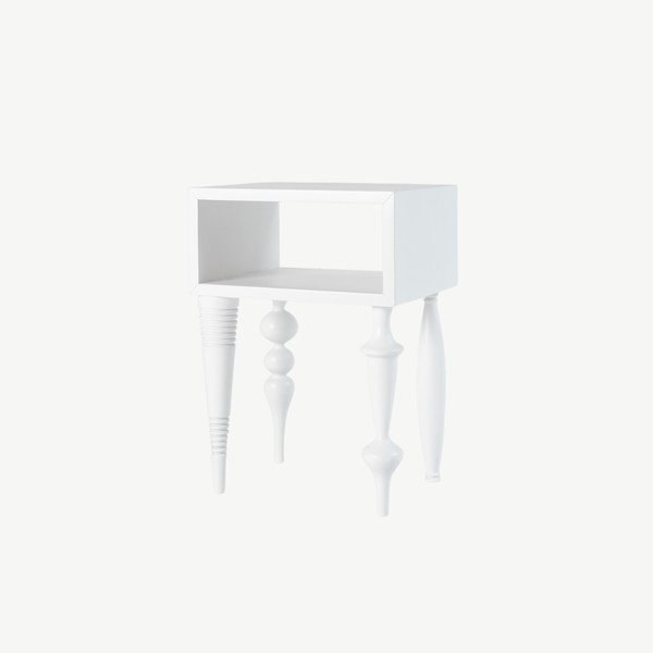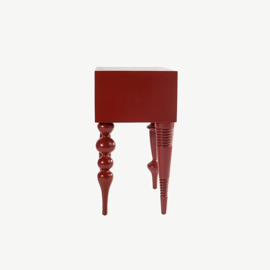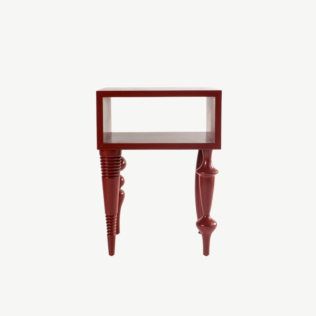 Bàn cạnh với kiểu thiết kế độc đáo kết hợp giữa độ phức tạp của chân tiện và sự đơn giản của khối mặt bàn gây ấn tượng cho người dùng. Bàn bằng gỗ tự nhiên sơn PU trong để lộ vân gỗ.