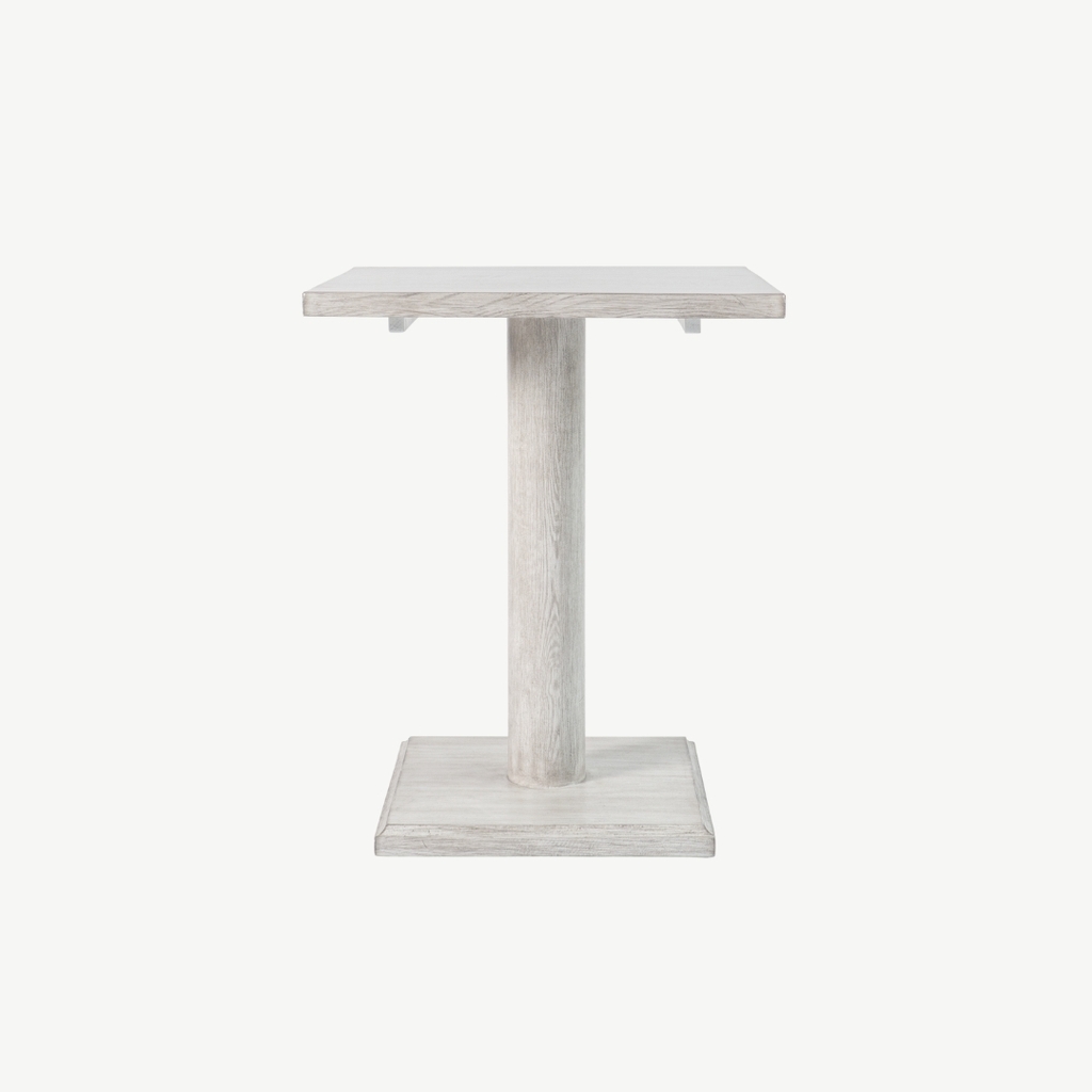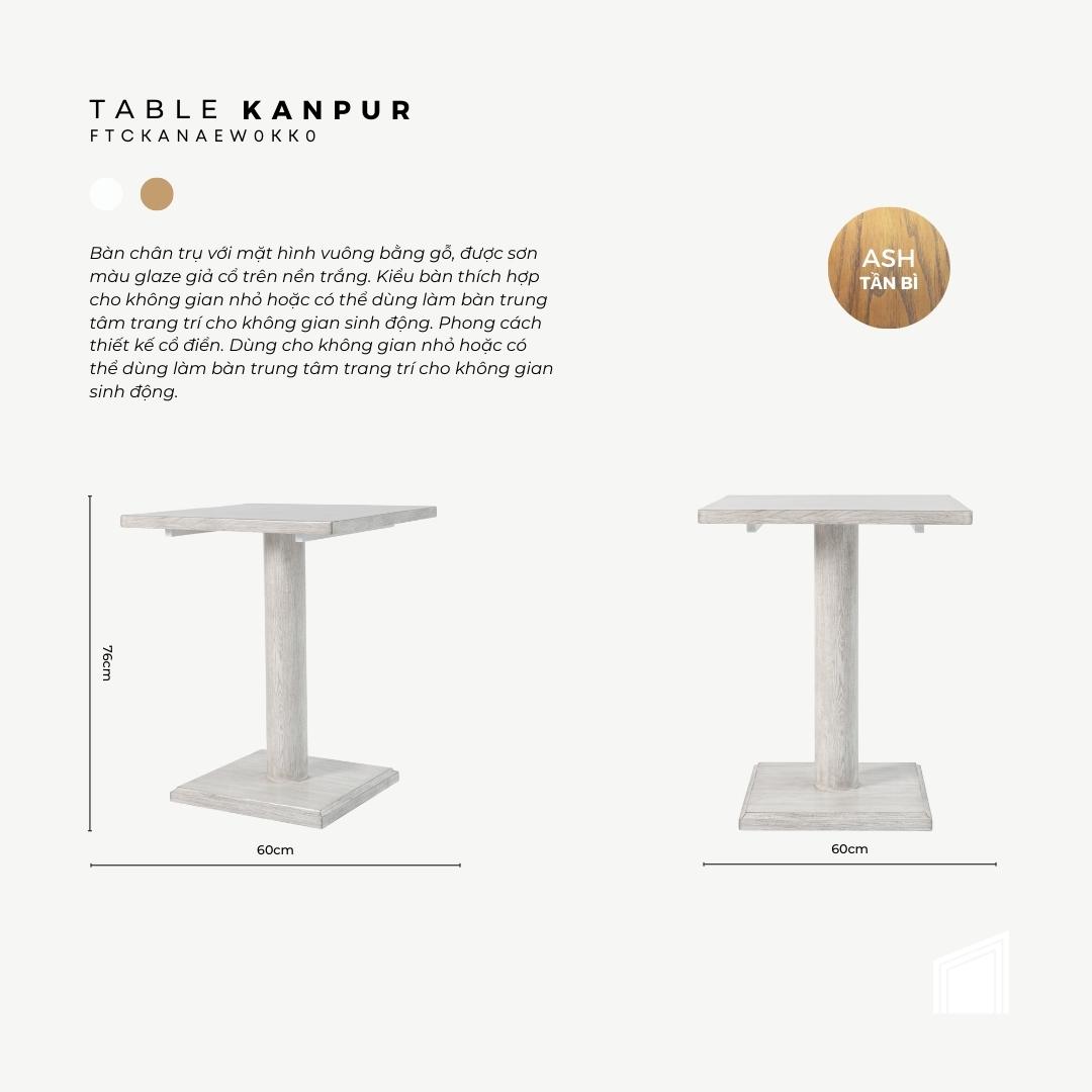 Bàn chân trụ với mặt hình vuông bằng gỗ, được sơn màu glaze giả cổ trên nền trắng. Kiểu bàn thích hợp cho không gian nhỏ hoặc có thể dùng làm bàn trung tâm trang trí cho không gian sinh động.