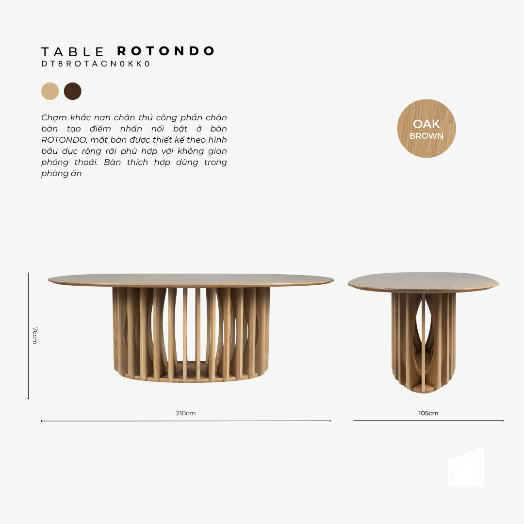 Chạm khắc nan chân thủ công phần chân bàn tạo điểm nhấn nổi bật ở bàn ROTONDO, mặt bàn được thiết kế theo hình bầu dục rộng rãi phù hợp với không gian phóng thoái. Bàn thích hợp dùng trong phòng ăn