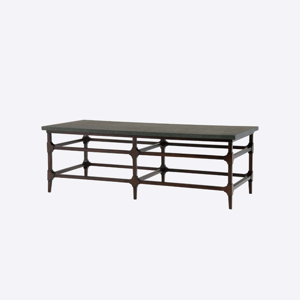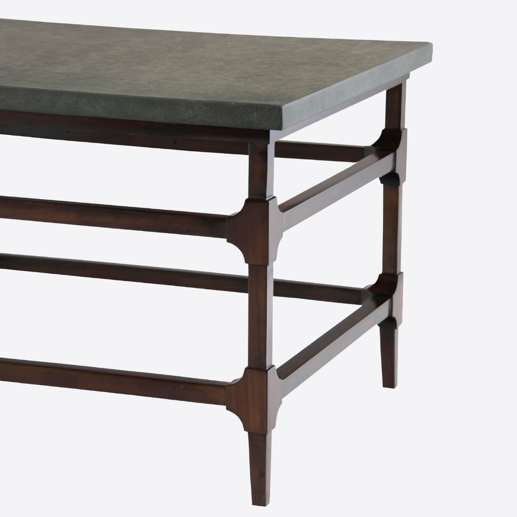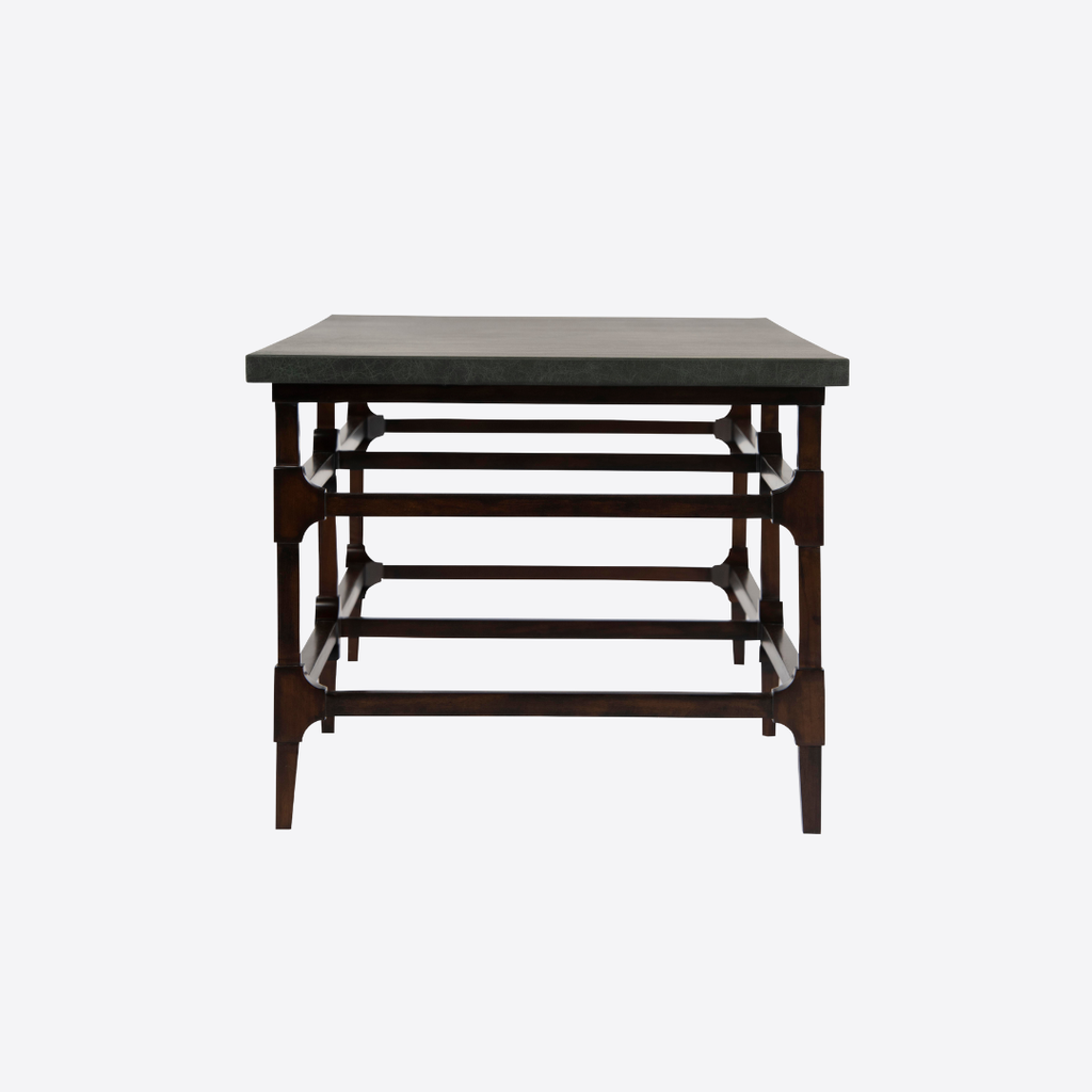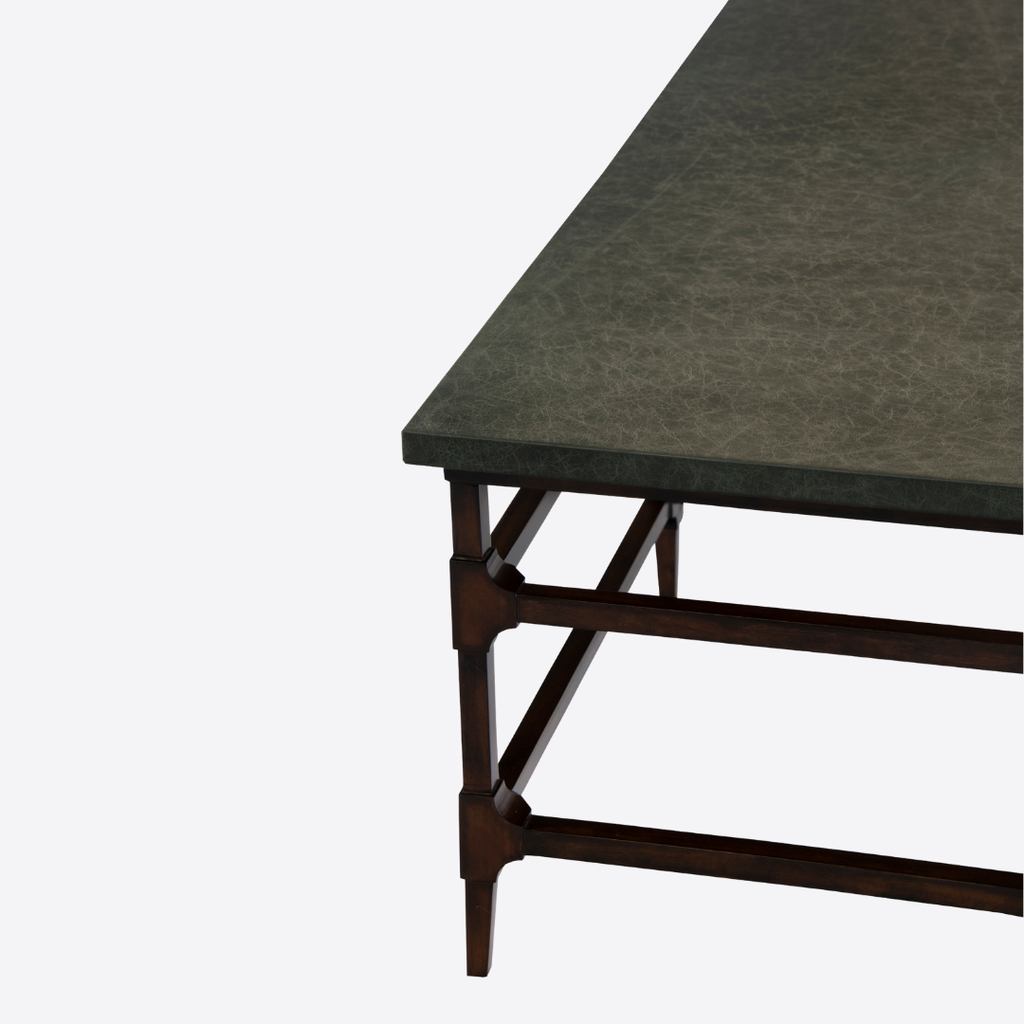 Một kiểu bàn cổ điển có khung chân bằng gỗ Acacia song song vòng quanh và điểm nhấn ở các góc nối. Mặt bàn được bọc tỉ mỉ bằng da Ý nhuộm màu xanh lá có vân giả cổ tăng phần sang trọng mềm mại cho thiết kế.