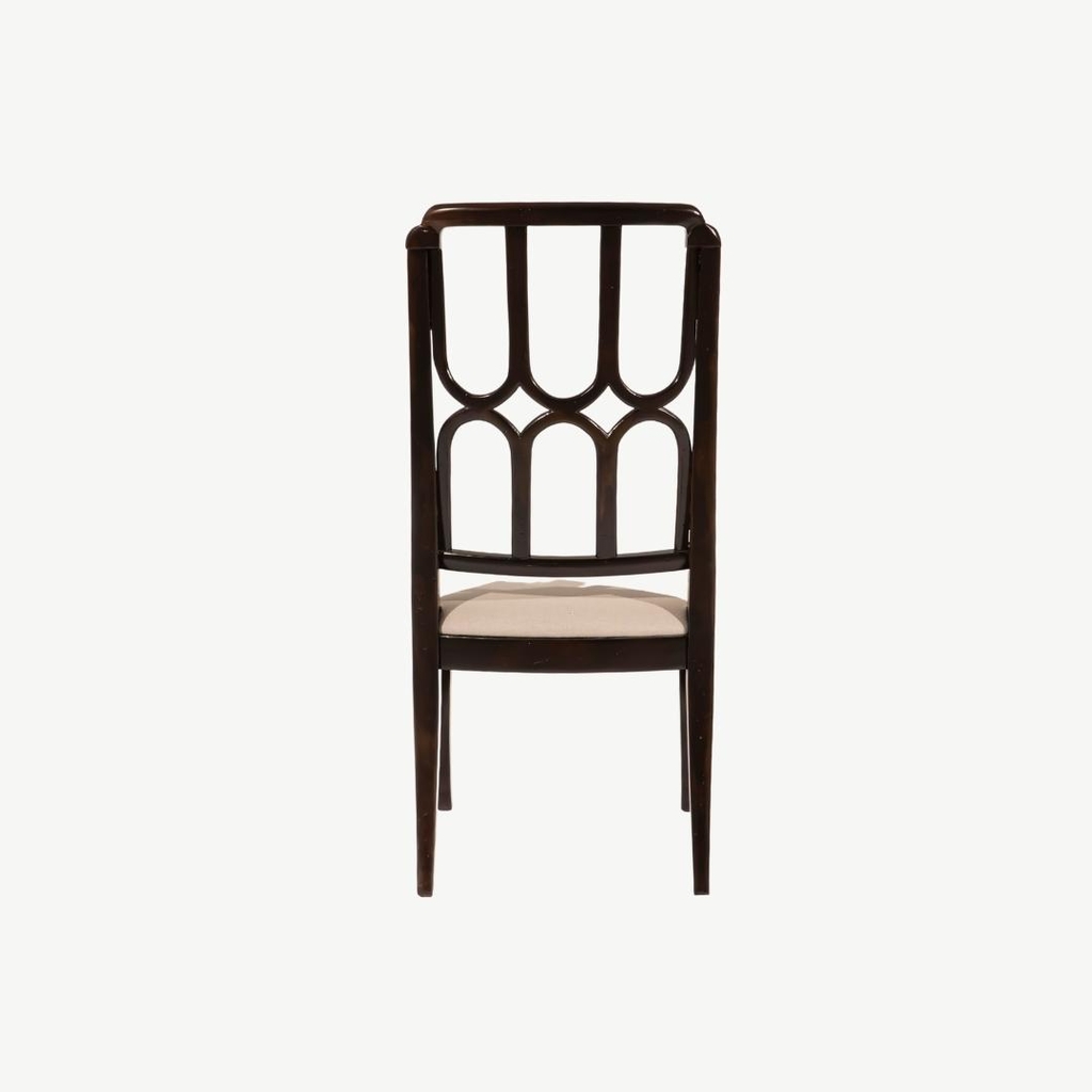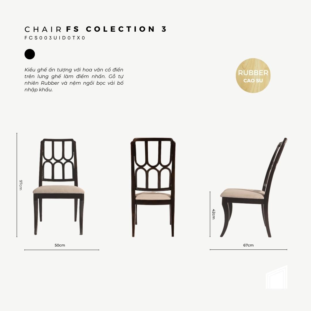 Kiểu ghế ấn tượng với hoa văn cổ điển trên lưng ghế làm điểm nhấn. Gỗ tự nhiên Rubber và nệm ngồi bọc vải bố nhập khẩu.