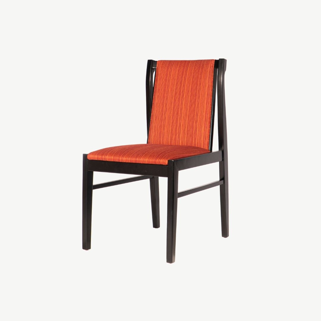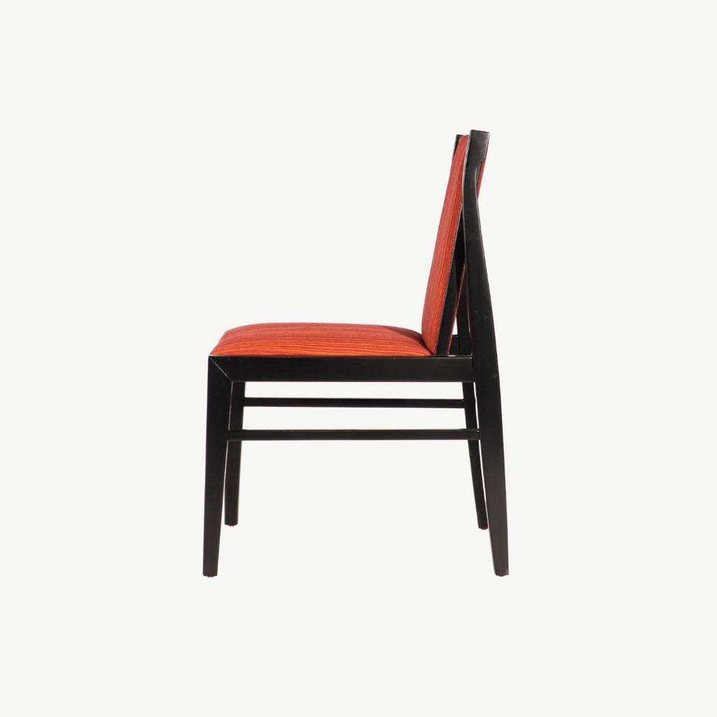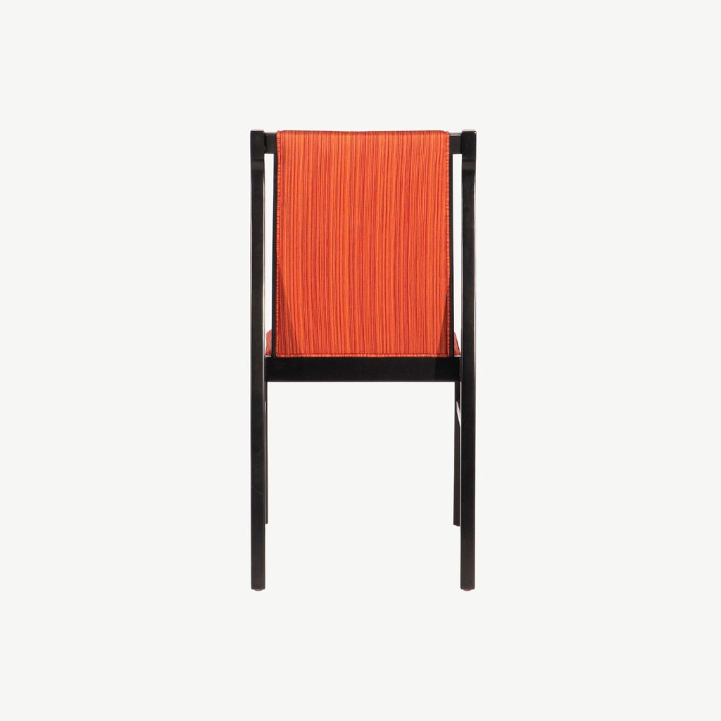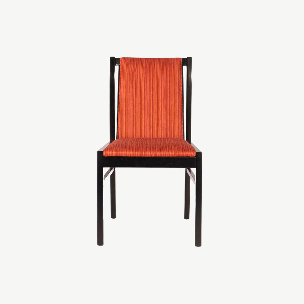 Ghế khung gỗ tự nhiên sơn đen phủ sớ kết hợp với vải sọc đỏ tạo nên nét sang trọng ấn tượng.