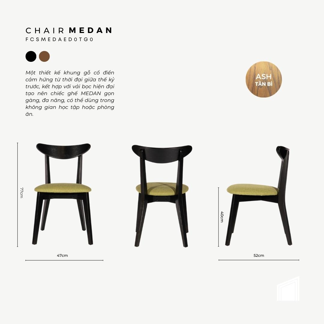 Một thiết kế khung gỗ cổ điển cảm hứng từ thời đại giữa thế kỷ trước, kết hợp với vải bọc hiện đại tạo nên chiếc ghế Medan gọn gàng, đa năng, có thể dùng trong không gian học tập hoặc phòng ăn.