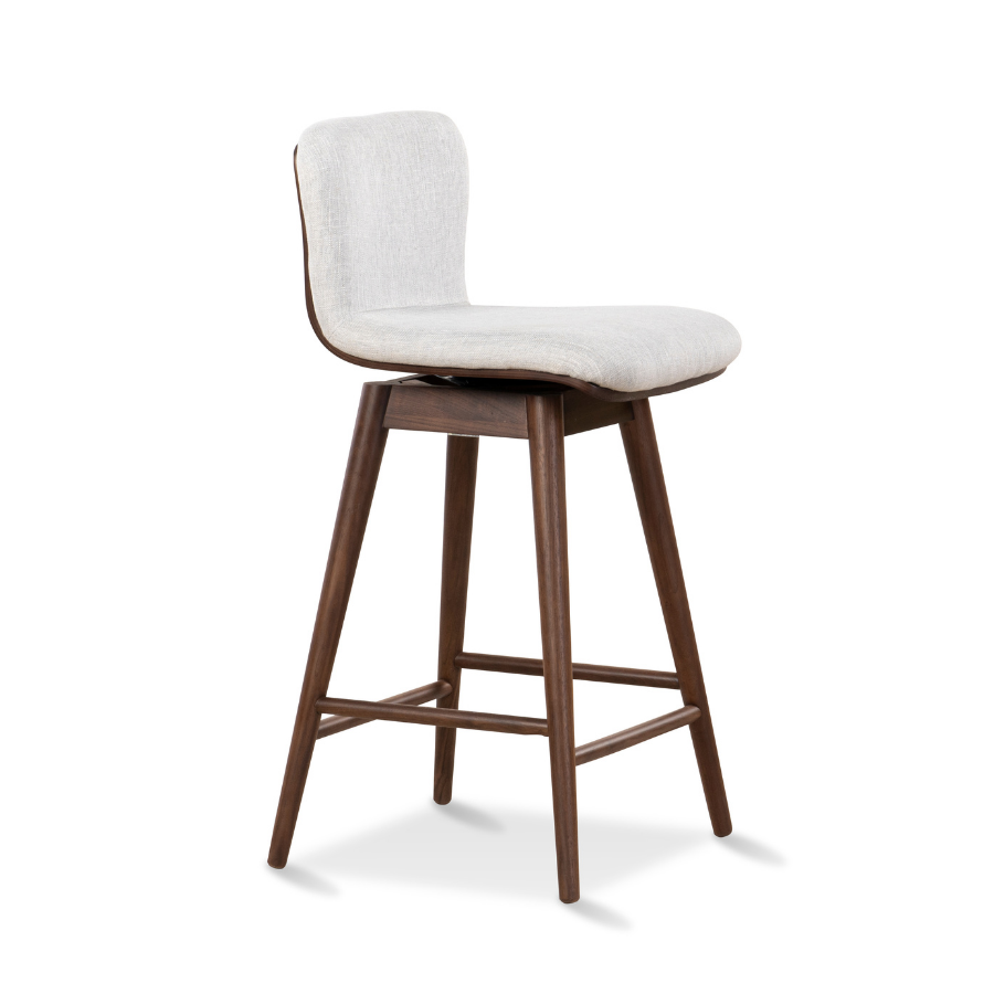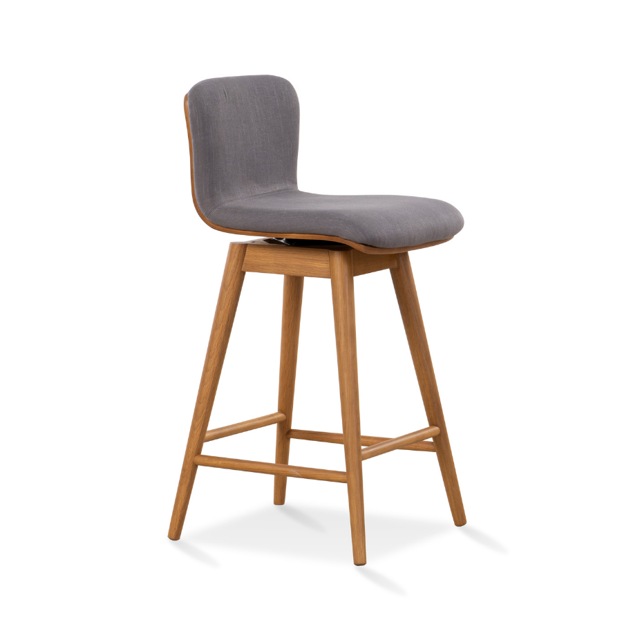 Ghế quầy bar hiện đại với khung gỗ sồi/óc chó chắc chắn, kết hợp nệm bọc vải xám tinh tế. Thiết kế tối giản nhưng sang trọng, mang lại sự thoải mái và bền bỉ.