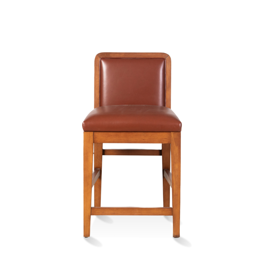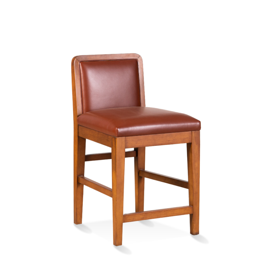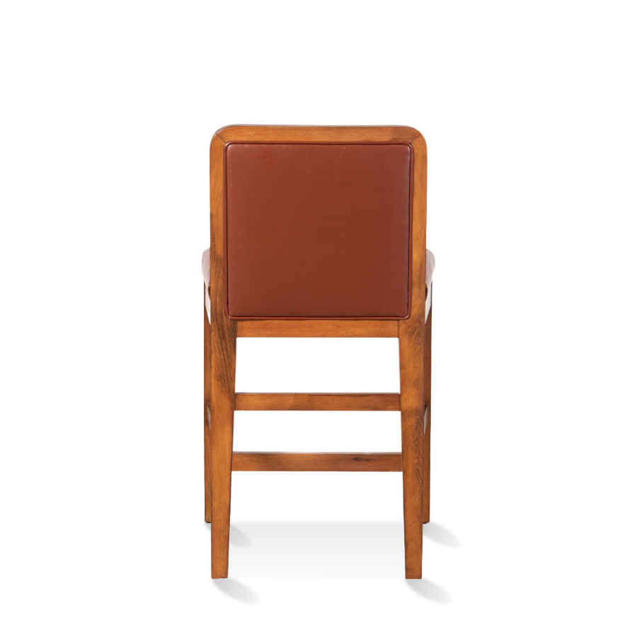 Ghế quầy bar gỗ dẻ gai chắc chắn, form dáng vuông vức với lưng tựa thấp. Đệm và lưng bọc PVC (Simili) nâu, bề mặt mịn, dễ vệ sinh và chống thấm.Thiết kế tối giản, mang nét gọn gàng và tiện dụng, phù hợp nhiều không gian.