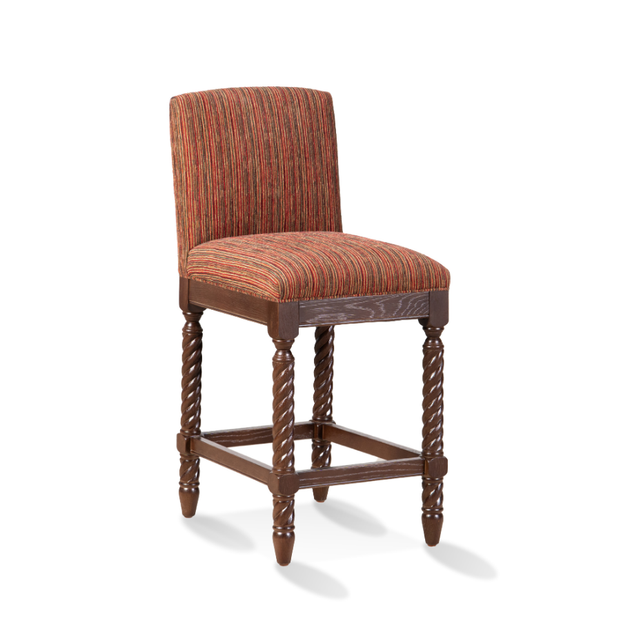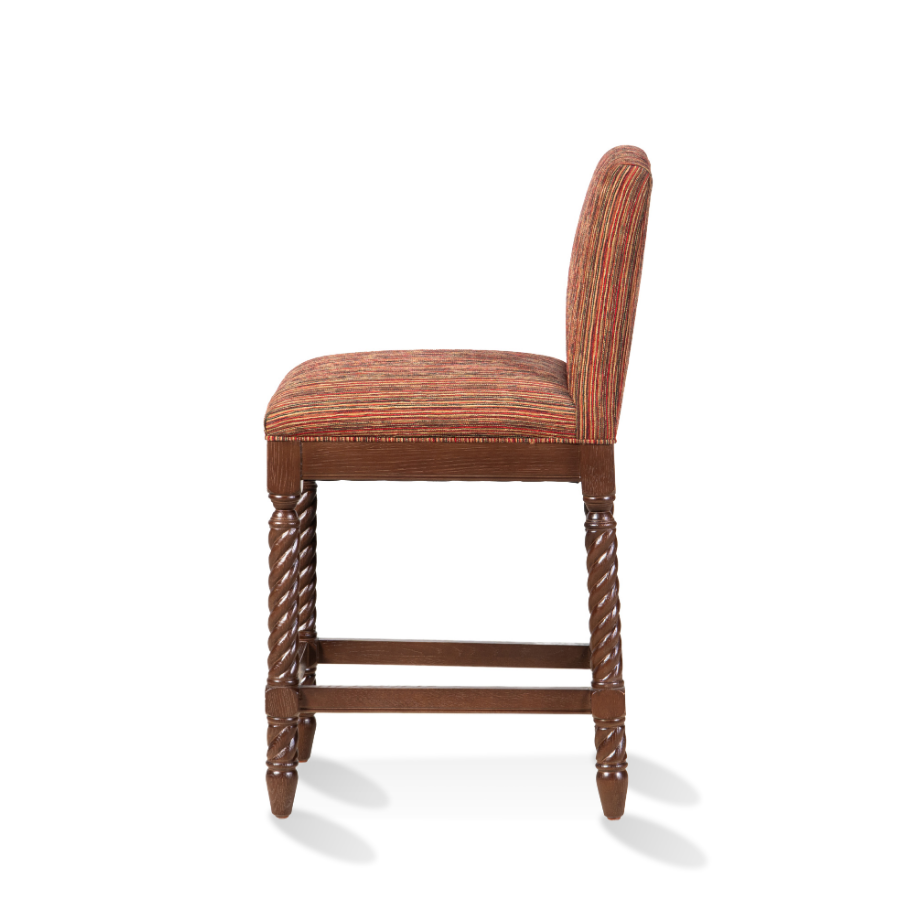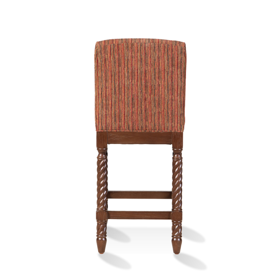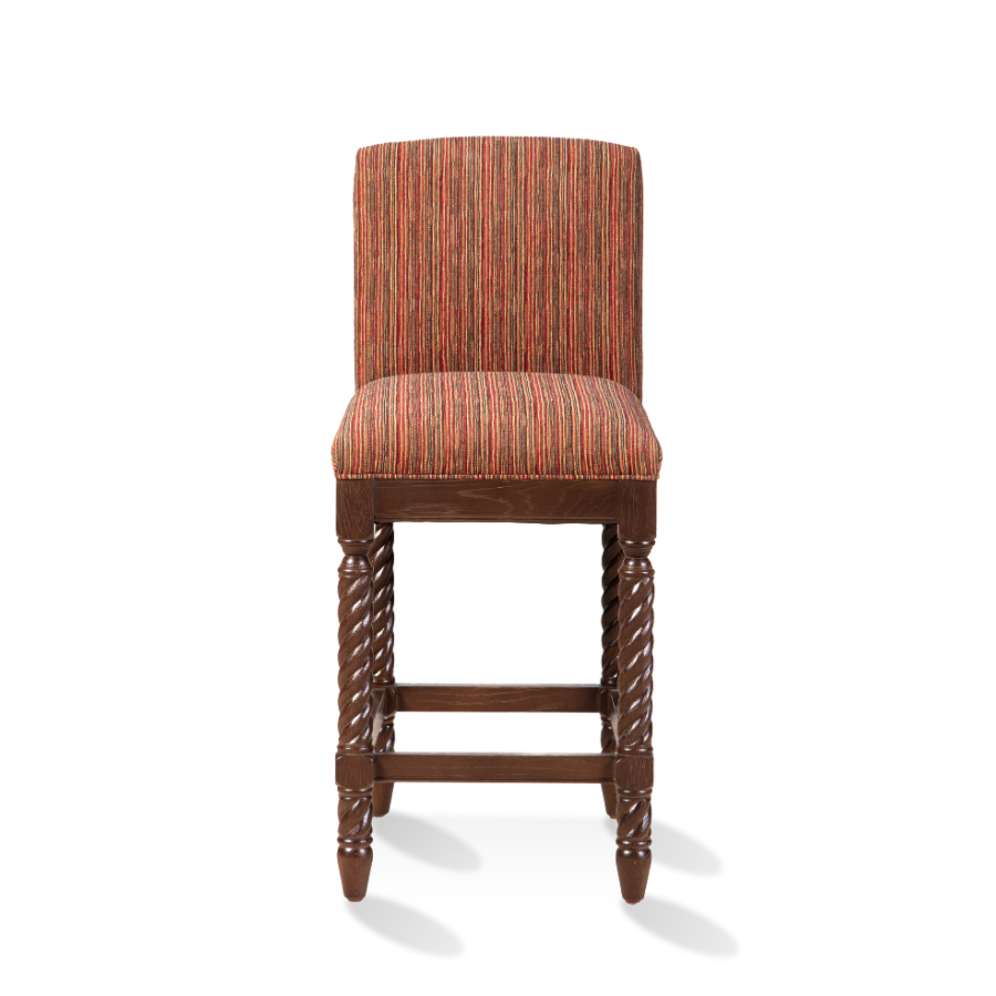 Ghế quầy bar gỗ sồi với thiết kế chân xoắn tinh xảo, kết hợp đệm vải sọc ấm áp mang đậm nét cổ điển. Kiểu dáng sang trọng, bền chắc, dễ dàng trở thành điểm nhấn trong không gian.