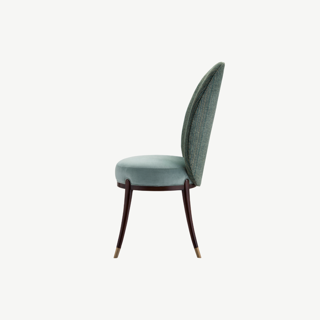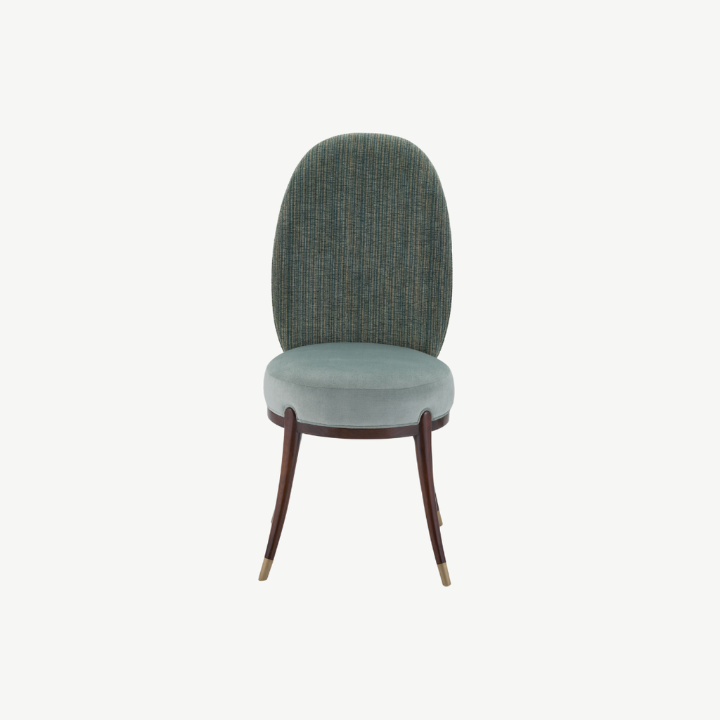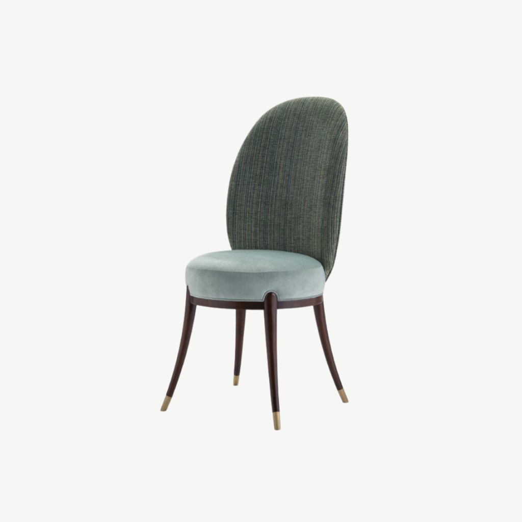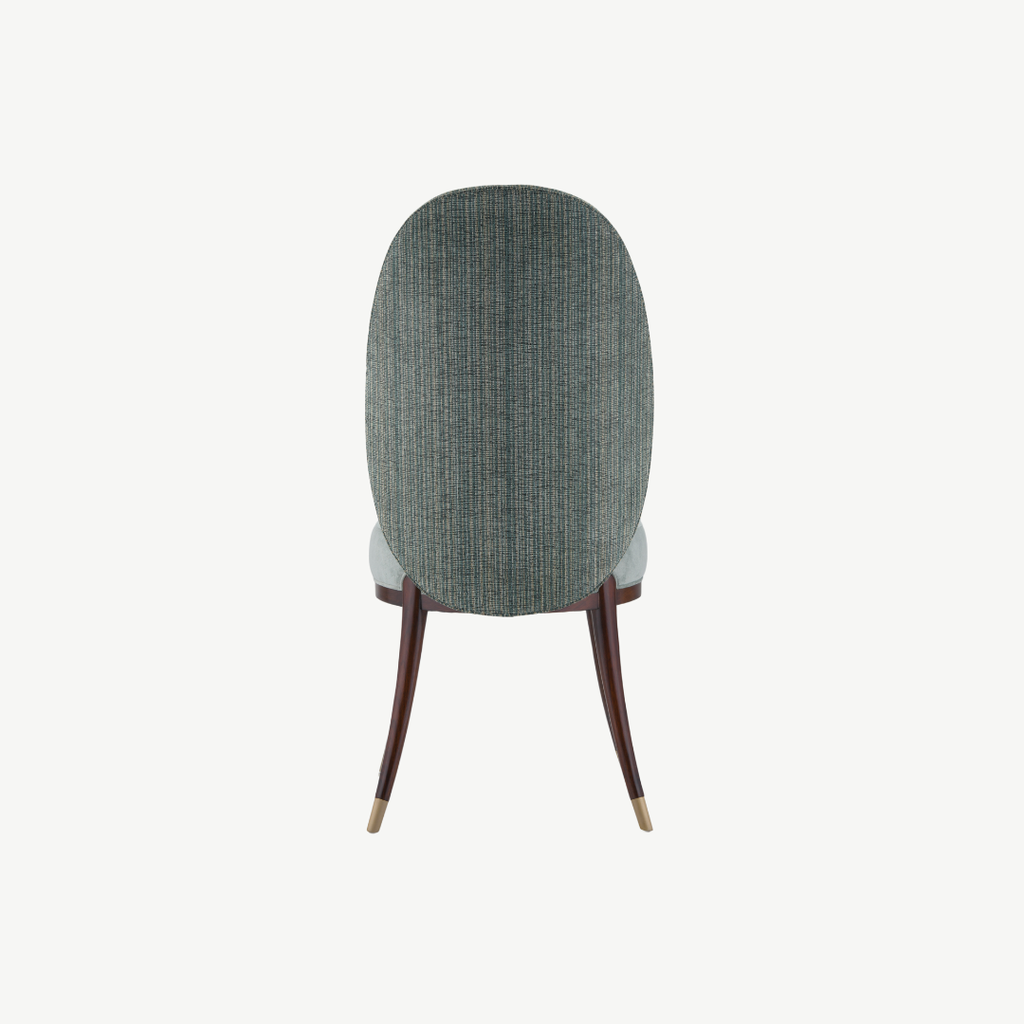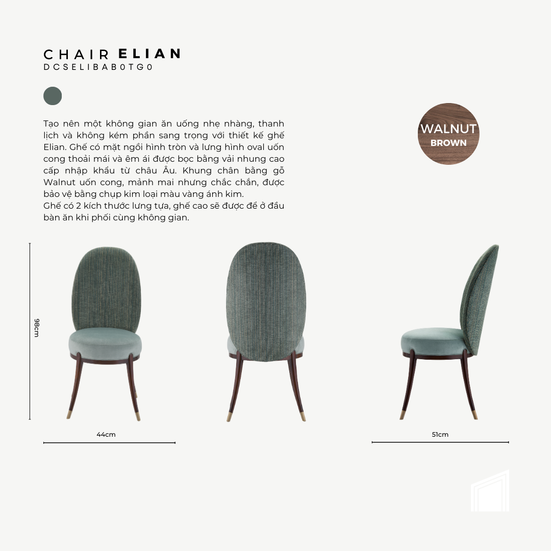 Tạo nên một không gian ăn uống nhẹ nhàng, thanh lịch và không kém phần sang trọng với thiết kế ghế Elian. Ghế có mặt ngồi hình tròn và lưng hình oval uốn cong thoải mái và êm ái được bọc bằng vải nhung cao cấp nhập khẩu từ châu Âu. Khung chân bằng gỗ Walnut uốn cong, mảnh mai nhưng chắc chắn, được bảo vệ bằng chụp kim loại màu vàng ánh kim. Ghế có 2 kích thước lưng tựa, ghế cao sẽ được để ở đầu bàn ăn khi phối cùng không gian.