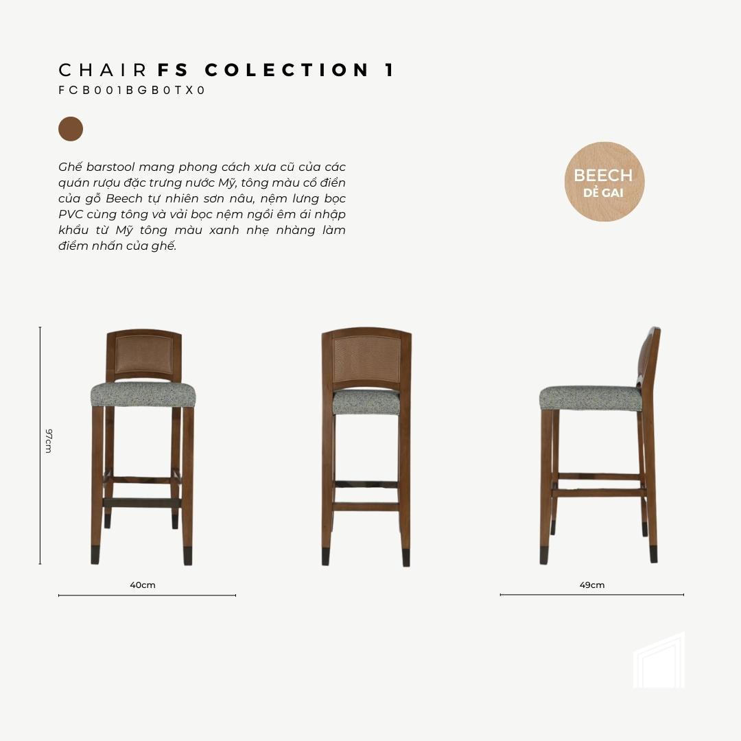 Ghế barstool mang phong cách xưa cũ của các quán rượu đặc trưng nước Mỹ, tông màu cổ điển của gỗ Beech tự nhiên sơn nâu, nệm lưng bọc PVC cùng tông và vải bọc nệm ngồi êm ái nhập khẩu từ Mỹ tông màu xanh nhẹ nhàng làm điểm nhấn của ghế.