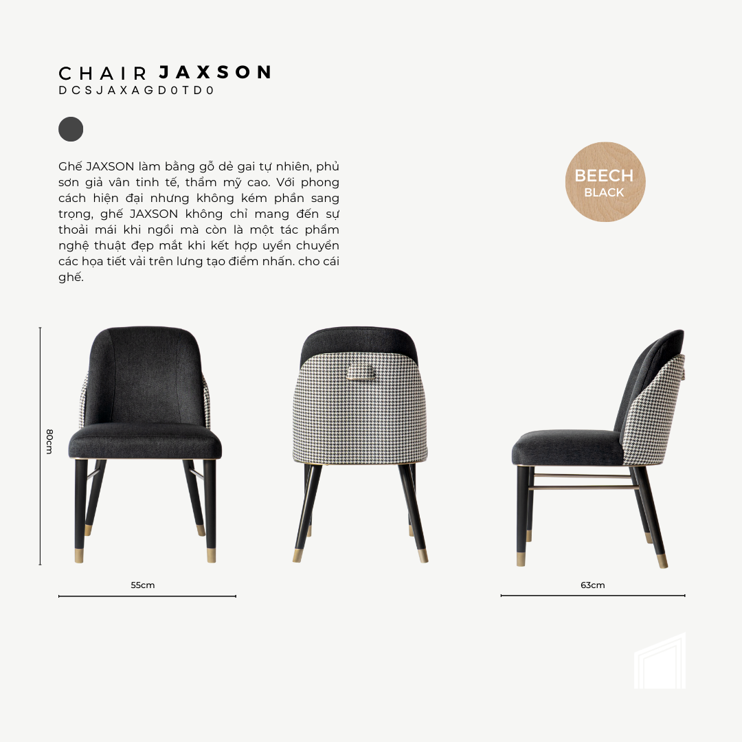 Ghế JAXSON làm bằng gỗ dẻ gai tự nhiên, phủ sơn giả vân tinh tế, thẩm mỹ cao. Với phong cách hiện đại nhưng không kém phần sang trọng, ghế JAXSON không chỉ mang đến sự thoải mái khi ngồi mà còn là một tác phẩm nghệ thuật đẹp mắt khi kết hợp uyển chuyển các họa tiết vải trên lưng tạo điểm nhấn. cho cái ghế.