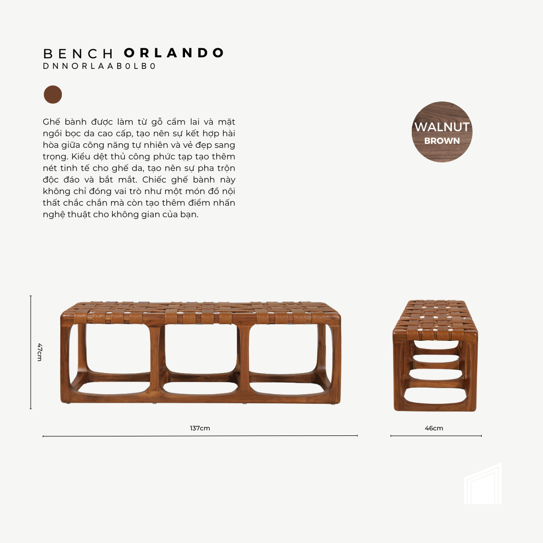 Chiếc ghế băng có mặt ngồi dệt da lấy cảm hứng từ nghệ thuật thủ công truyền thống kết hợp trong hình dáng hiện đại của khung gỗ Walnut chắc chắn. Màu sắc của băng ghế Orlando được giữ tự nhiên với tông nâu của gỗ và da Ý, việc sử dụng kỹ thuật tay sẽ có những nét tự nhiên không hoàn hảo nhưng được xem là đặc trưng đắt giá của sản phẩm.