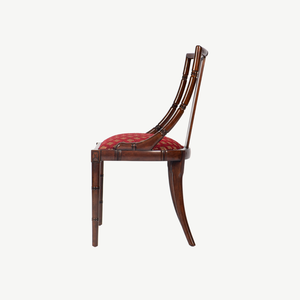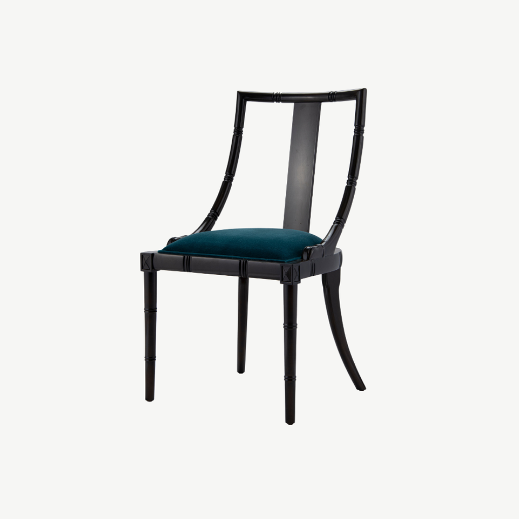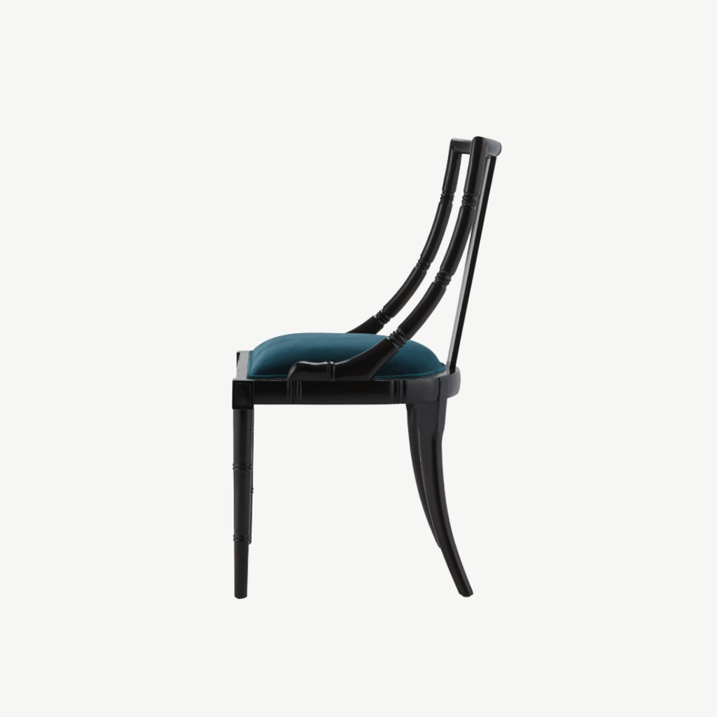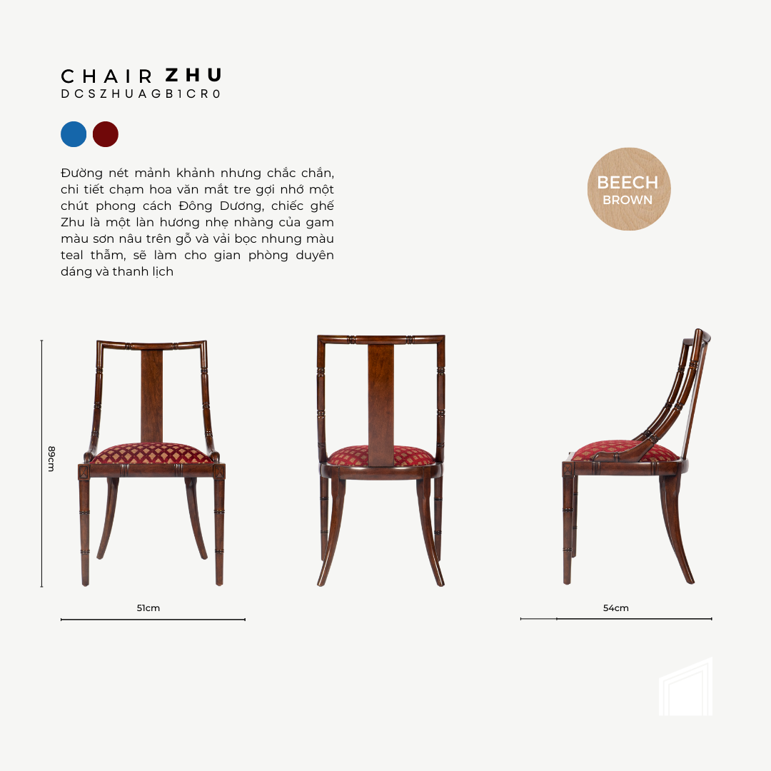Đường nét mảnh khảnh nhưng chắc chắn, chi tiết chạm hoa văn mắt tre gợi nhớ một chút phong cách Đông Dương, chiếc ghế Zhu là một làn hương nhẹ nhàng của gam màu sơn nâu trên gỗ và vải bọc nhung màu teal thẫm, sẽ làm cho gian phòng duyên dáng và thanh lịch