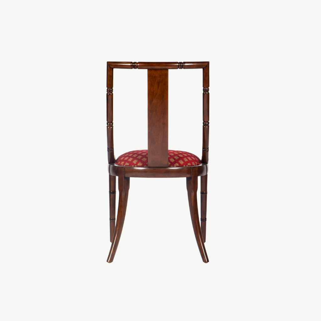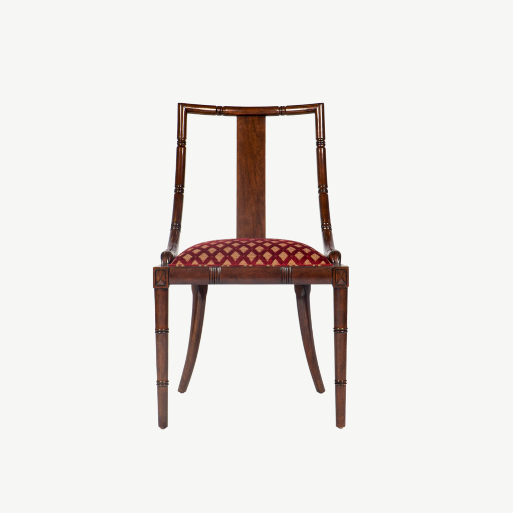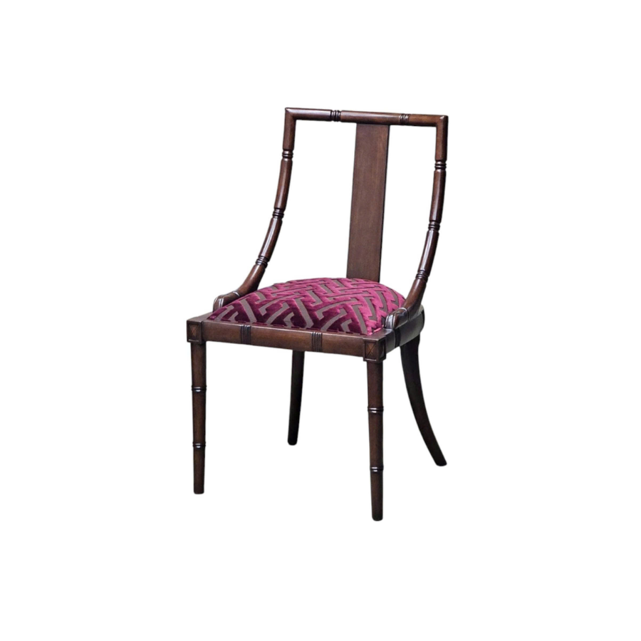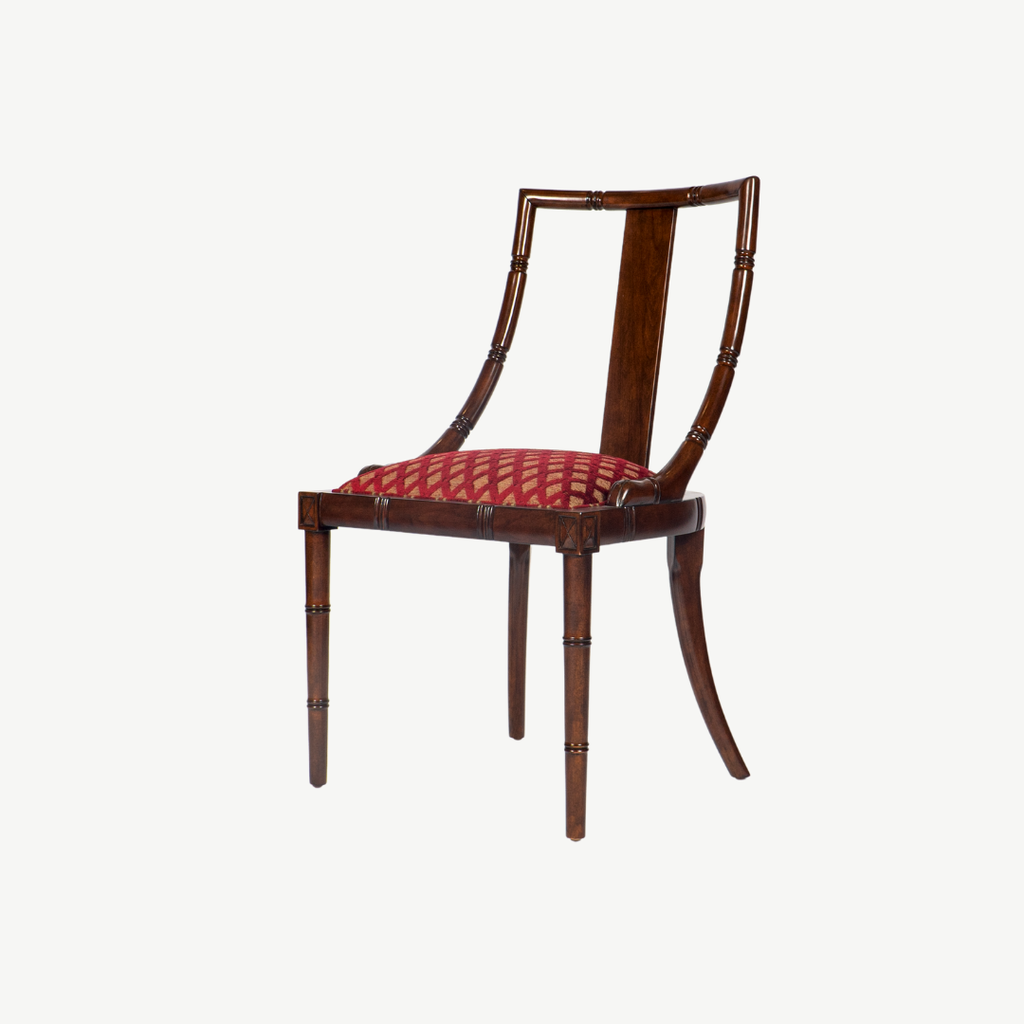 Đường nét mảnh khảnh nhưng chắc chắn, chi tiết chạm hoa văn mắt tre gợi nhớ một chút phong cách Đông Dương, chiếc ghế Zhu là một làn hương nhẹ nhàng của gam màu sơn nâu trên gỗ và vải bọc nhung màu teal thẫm, sẽ làm cho gian phòng duyên dáng và thanh lịch