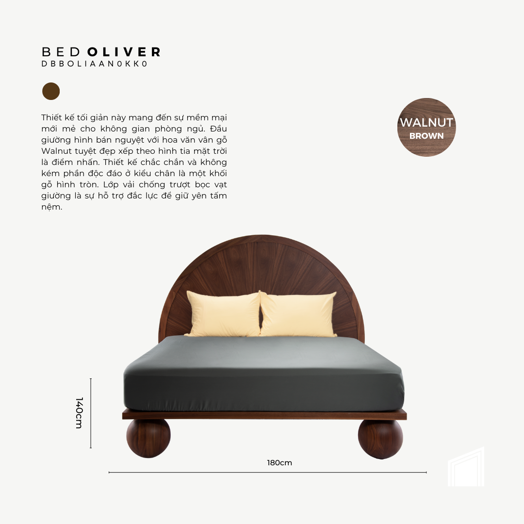 Thiết kế tối giản này mang đến sự mềm mại mới mẻ cho không gian phòng ngủ. Đầu giường hình bán nguyệt với hoa văn vân gỗ Walnut tuyệt đẹp xếp theo hình tia mặt trời là điểm nhấn. Thiết kế chắc chắn và không kém phần độc đáo ở kiểu chân là một khối gỗ hình tròn. Lớp vải chống trượt bọc vạt giường là sự hỗ trợ đắc lực để giữ yên tấm nệm.