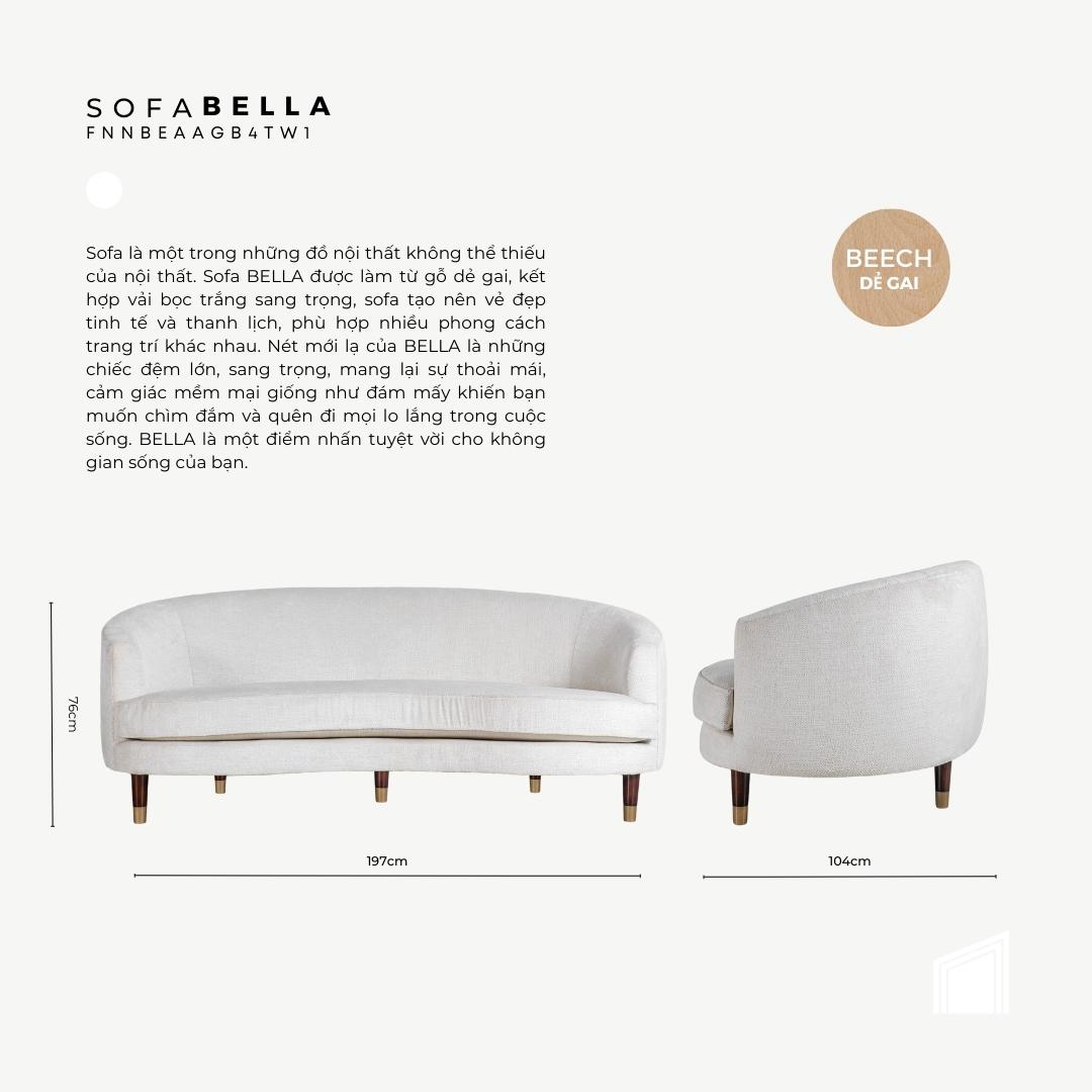 Sofa là một trong những đồ nội thất không thể thiếu của nội thất. Sofa BELLA được làm từ gỗ dẻ gai, kết hợp vải bọc trắng sang trọng, sofa tạo nên vẻ đẹp tinh tế và thanh lịch, phù hợp nhiều phong cách trang trí khác nhau. Nét mới lạ của BELLA là những chiếc đệm lớn, sang trọng, mang lại sự thoải mái, cảm giác mềm mại giống như đám mấy khiến bạn muốn chìm đắm và quên đi mọi lo lắng trong cuộc sống. BELLA là một điểm nhấn tuyệt vời cho không gian sống của bạn.