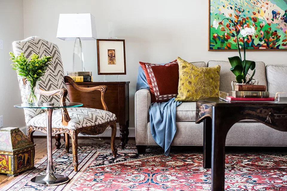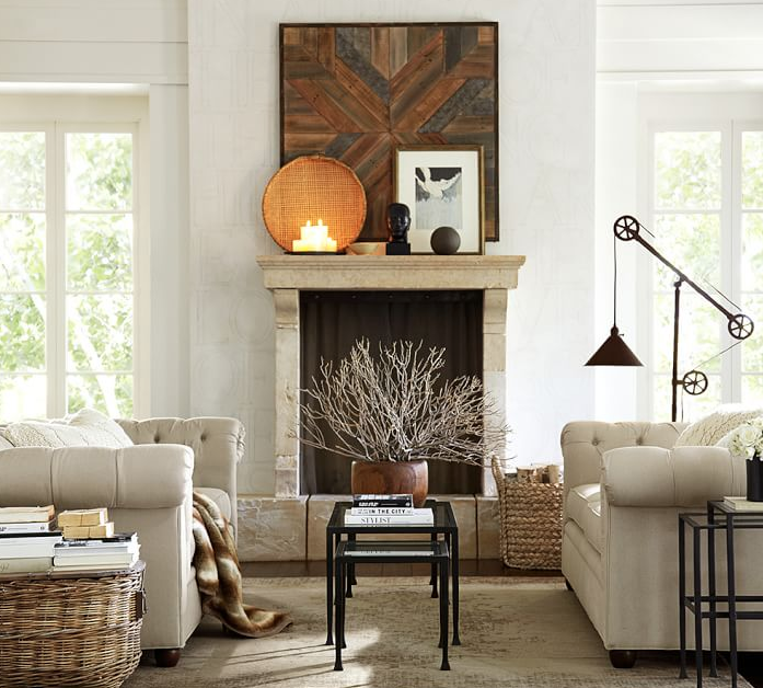 Chất liệu kết hợp đa dạng: gỗ, vải bọc, thảm sàn, rèm cửa, đồ gốm sứ... Có thể kết hợp với mây tre.