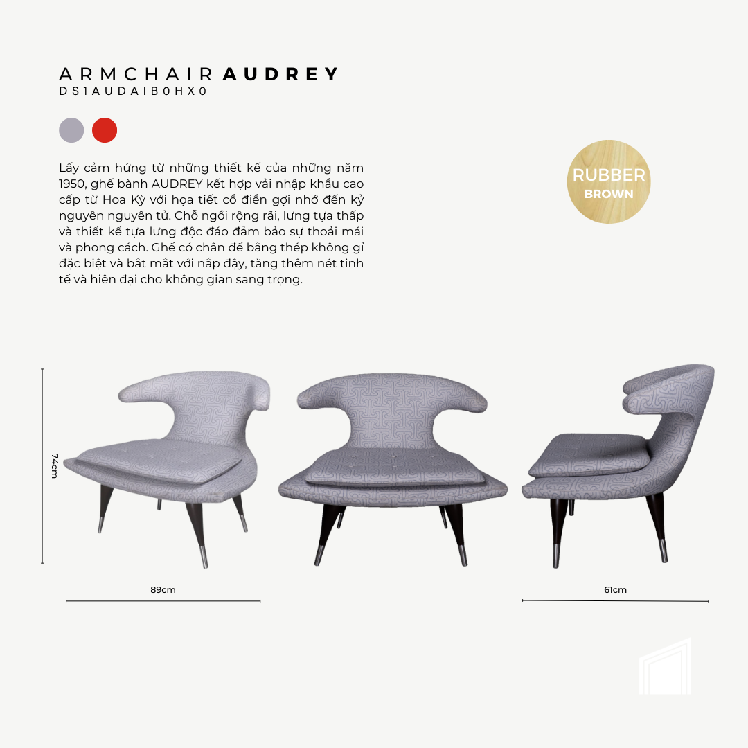 Lấy cảm hứng từ các thiết kế của thập niên 1950. Vải bọc cao cấp nhập từ Mỹ có hoa văn kỷ hà là sự phối hợp đồng điệu với thiết kế như 1 nguyên tử của chiếc ghế bành Audrey này. Mặt ngồi rộng rãi, cao ngồi có độ dốc thấp và kiểu lưng tựa độc đáo nhưng không kém phần thoải mái khi sử dụng, các yếu tố này kết hợp với kiểu chân khác lạ có gắn chụp bằng stainless steel tạo nên một điểm nhấn khác biệt cho không gian sang trọng mang hơi thở đương đại của gia chủ.
