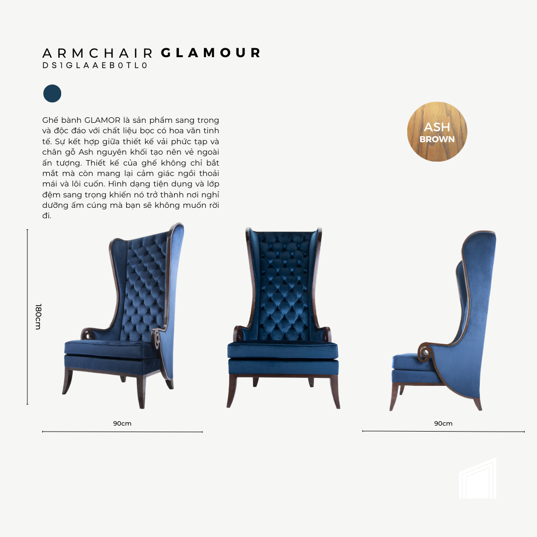 Ghế bành GLAMOR là sản phẩm sang trọng và độc đáo với chất liệu bọc có hoa văn tinh tế. Sự kết hợp giữa thiết kế vải phức tạp và chân gỗ Ash nguyên khối tạo nên vẻ ngoài ấn tượng. Thiết kế của ghế không chỉ bắt mắt mà còn mang lại cảm giác ngồi thoải mái và lôi cuốn. Hình dạng tiện dụng và lớp đệm sang trọng khiến nó trở thành nơi nghỉ dưỡng ấm cúng mà bạn sẽ không muốn rời đi.