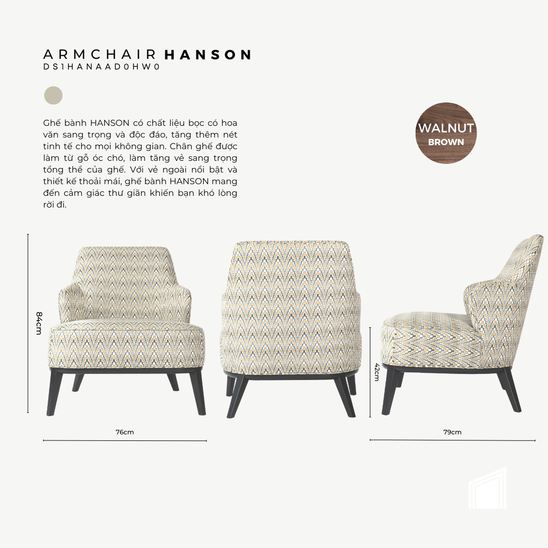 Ghế bành HANSON có chất liệu bọc có hoa văn sang trọng và độc đáo, tăng thêm nét tinh tế cho mọi không gian. Chân ghế được làm từ gỗ óc chó, làm tăng vẻ sang trọng tổng thể của ghế. Với vẻ ngoài nổi bật và thiết kế thoải mái, ghế bành HANSON mang đến cảm giác thư giãn khiến bạn khó lòng rời đi.