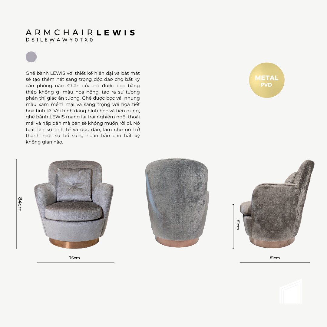 Ghế bành LEWIS với thiết kế hiện đại và bắt mắt sẽ tạo thêm nét sang trọng độc đáo cho bất kỳ căn phòng nào. Chân của nó được bọc bằng thép không gỉ màu hoa hồng, tạo ra sự tương phản thị giác ấn tượng. Ghế được bọc vải nhung màu xám mềm mại và sang trọng với họa tiết hoa tinh tế. Với hình dạng hình học và tiện dụng, ghế bành LEWIS mang lại trải nghiệm ngồi thoải mái và hấp dẫn mà bạn sẽ không muốn rời đi. Nó toát lên sự tinh tế và độc đáo, làm cho nó trở thành một sự bổ sung hoàn hảo cho bất kỳ không gian nào.