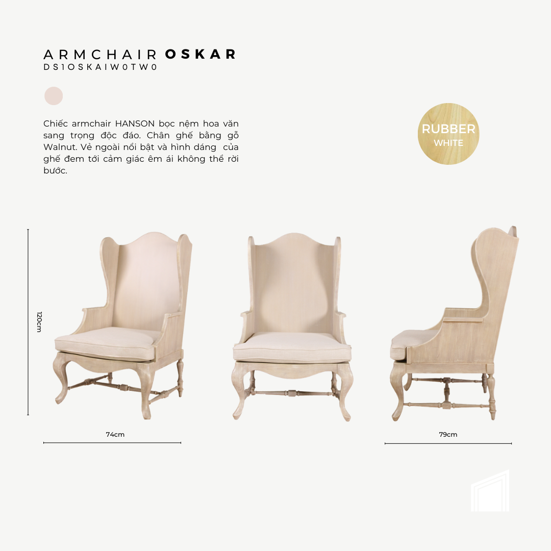 Chiếc armchair HANSON bọc nệm hoa văn sang trọng độc đáo. Chân ghế bằng gỗ Walnut. Vẻ ngoài nổi bật và hình dáng của ghế đem tới cảm giác êm ái không thể rời bước.