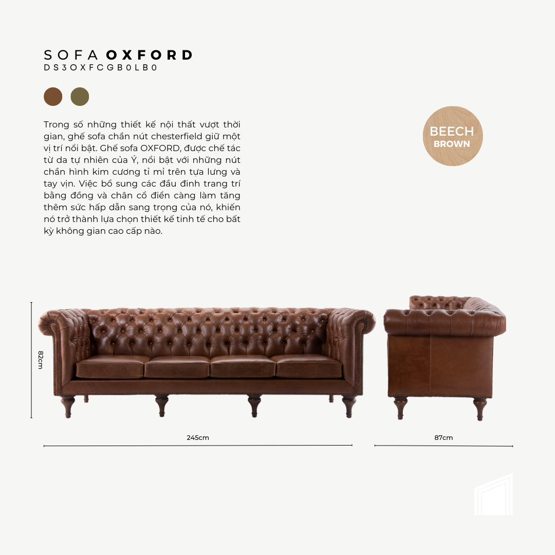 Trong số những thiết kế nội thất vượt thời gian, ghế sofa chần nút chesterfield giữ một vị trí nổi bật. Ghế sofa OXFORD, được chế tác từ da tự nhiên của Ý, nổi bật với những nút chần hình kim cương tỉ mỉ trên tựa lưng và tay vịn. Việc bổ sung các đầu đinh trang trí bằng đồng và chân cổ điển càng làm tăng thêm sức hấp dẫn sang trọng của nó, khiến nó trở thành lựa chọn thiết kế tinh tế cho bất kỳ không gian cao cấp nào.