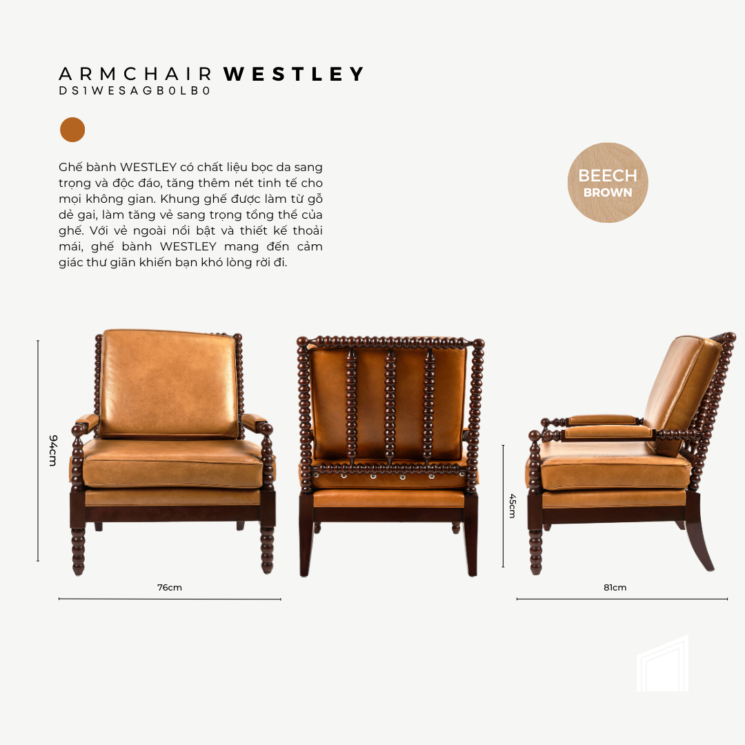 Ghế bành WESTLEY có chất liệu bọc da sang trọng và độc đáo, tăng thêm nét tinh tế cho mọi không gian. Khung ghế được làm từ gỗ dẻ gai, làm tăng vẻ sang trọng tổng thể của ghế. Với vẻ ngoài nổi bật và thiết kế thoải mái, ghế bành WESTLEY mang đến cảm giác thư giãn khiến bạn khó lòng rời đi.